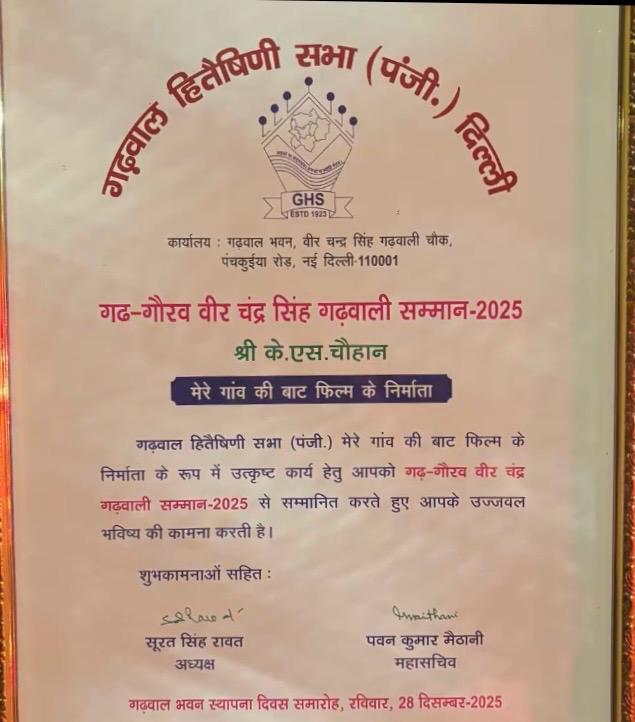 दिल्ली के गढ़वाल भवन में 67वें स्थापना दिवस पर जौनसारी भाषा की पहली फिल्म “मैरे गांव की बाट” को 2023-24 की सर्वश्रेष्ठ उत्तराखंडी फिल्म का अवॉर्ड मिला। फिल्म के निर्माता-निर्देशक को “गढ़ गौरव वीर चंद्र सिंह गढ़वाली सम्मान-2025” दिया गया। यह सम्मान जौनसारी संस्कृति, सामाजिक मूल्यों और परंपराओं को सिनेमा के जरिए शानदार तरीके से दिखाने के लिए मिला। वक्ताओं ने कहा कि उत्तराखंड की लोकल फिल्में राज्य की भाषाओं, संस्कृति और समस्याओं को देशभर में पहचान दिला रही हैं। इनसे लेखक, कलाकार और तकनीशियनों के लिए नए रोजगार के मौके भी बन रहे हैं।